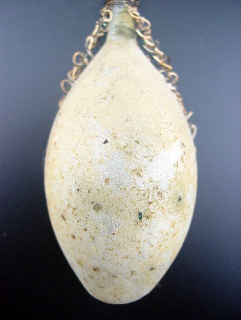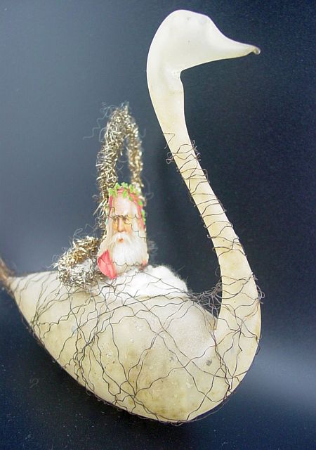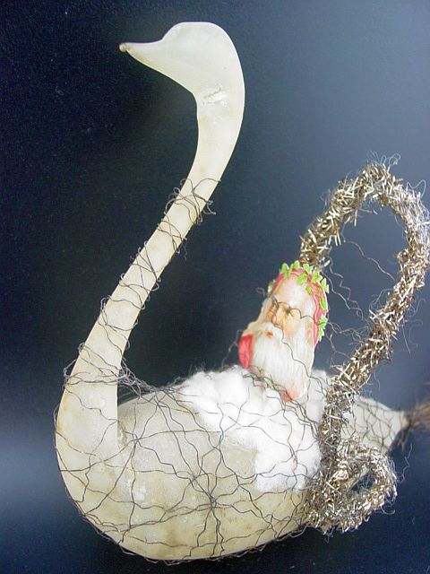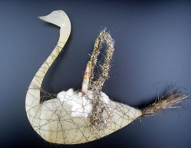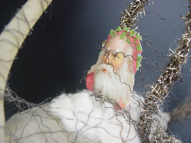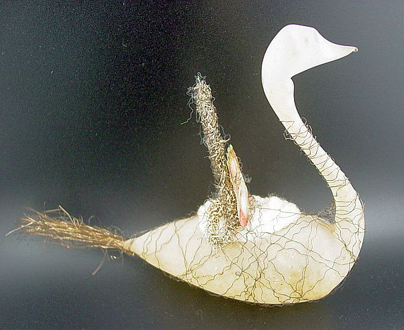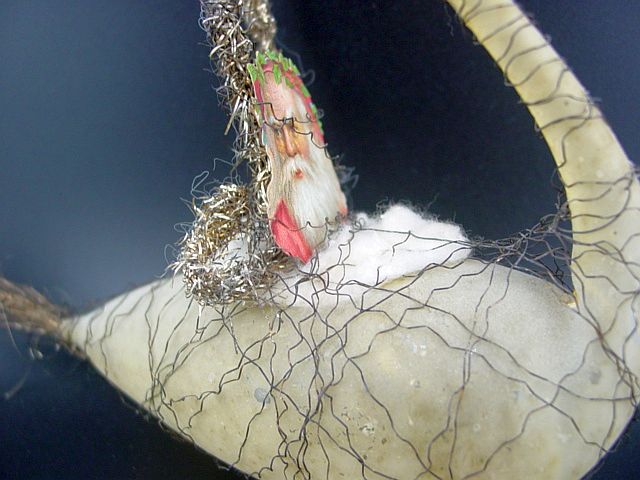A very early unsilvered glass spoon ornament. Decorated with heavy curly wire around the bowl and also forms the hanger. Painted in a soft pastel white that shows a little wear. The center of the bowl appears to be old tarnished gold paint. There is wire wrapping at the top of the bowl and top of the pike. A great piece. Additional photos are attached by the magnifying glass icon.