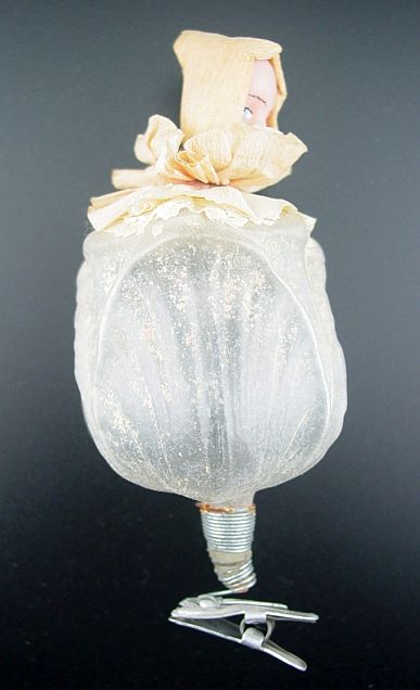 A rare unsilvered glass tulip on a clip with a wax head girl. She is adorned with a crepe paper ruffled collar and hood. Her hand painted face and the wax head are in excellent condition. The tulip has only remnants of what used to be soft pastel white and maybe some yellow details. I do not see any signs of oxidation inside the tulip which would indicate that it might have been silvered. The glass looks almost clear when held up to a light. This definitely is an earlier piece. Additional photos are attached by the magnifying glass icon.