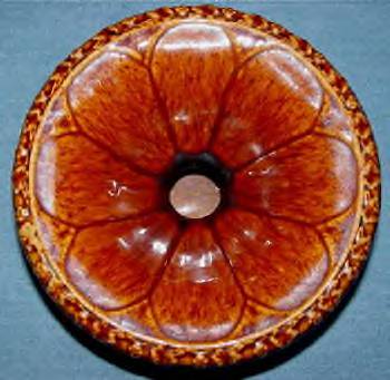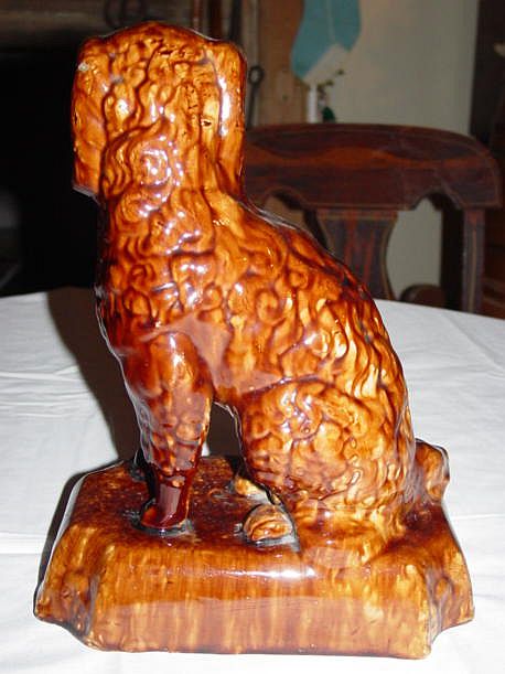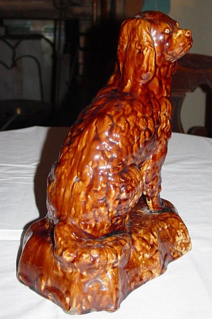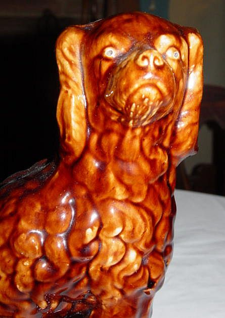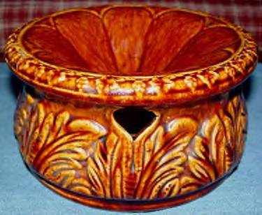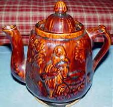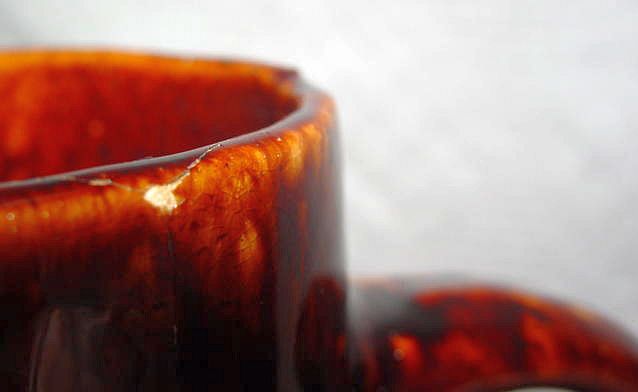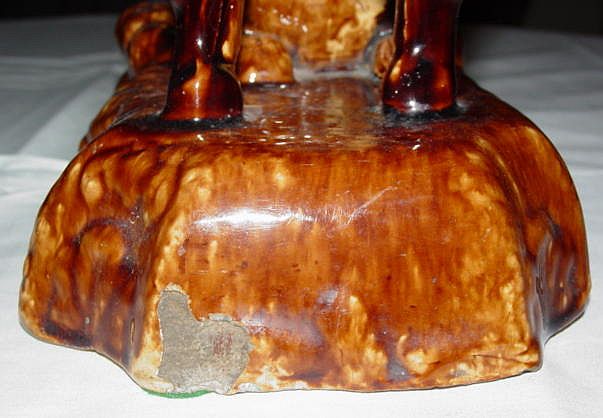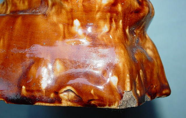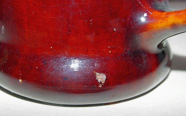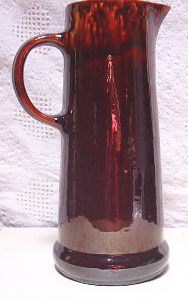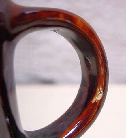 Tankard- 1 1/2" glaze crack from top of rim to the inside. 1/8" chip outside of top rim. 12 1/4" Height, 4" Diameter at top, 5 3/4" Diameter at base, 7 1/2" Width spout to handle