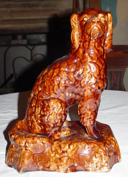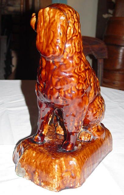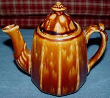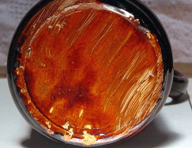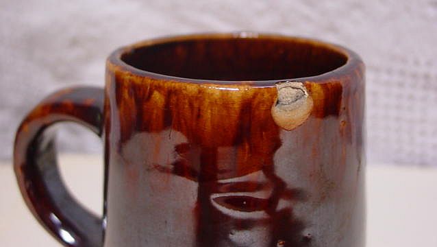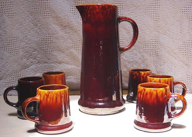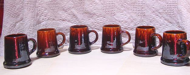 A nice yelloware tankard and six mugs set with a dark brown rockingham glaze. There are numerous kiln flaws (pits and pops) original in the making. These are typical of this type of ware. Additional photos are attached by the magnifying glass icon.