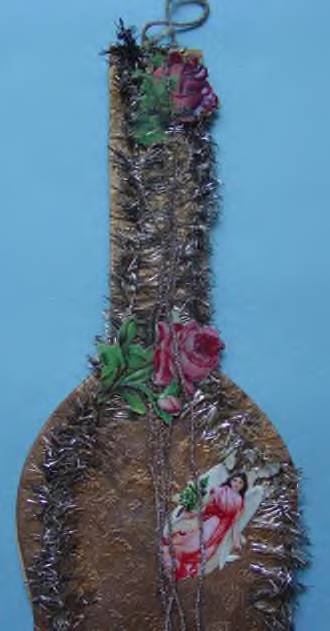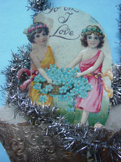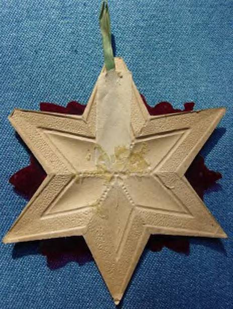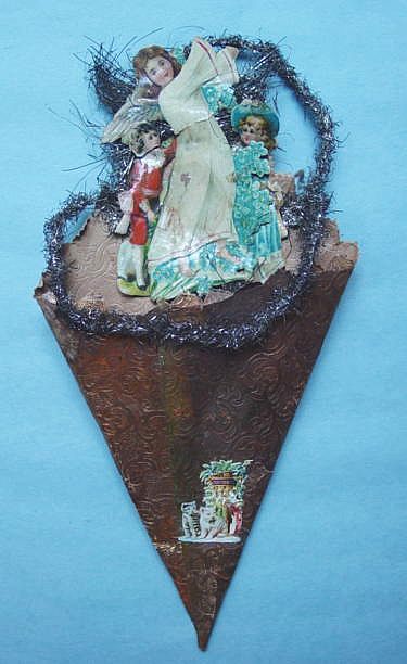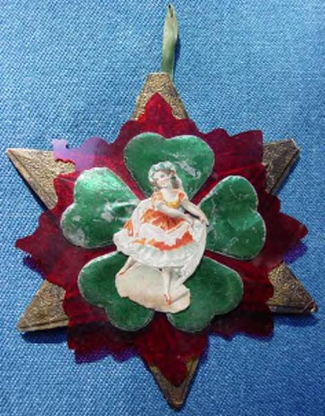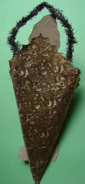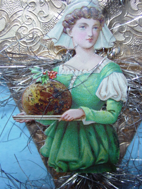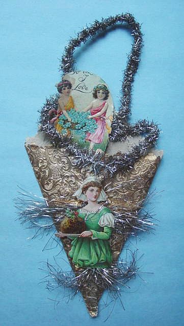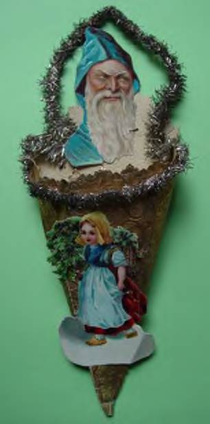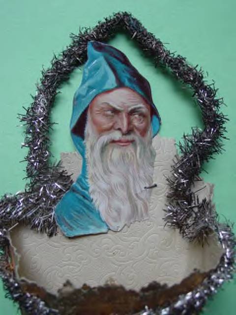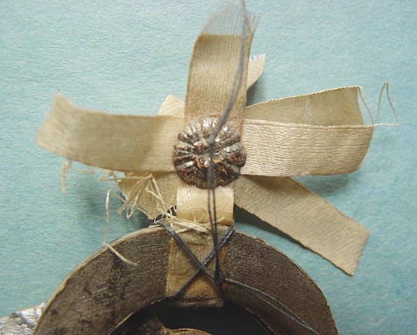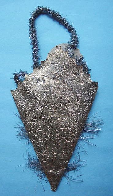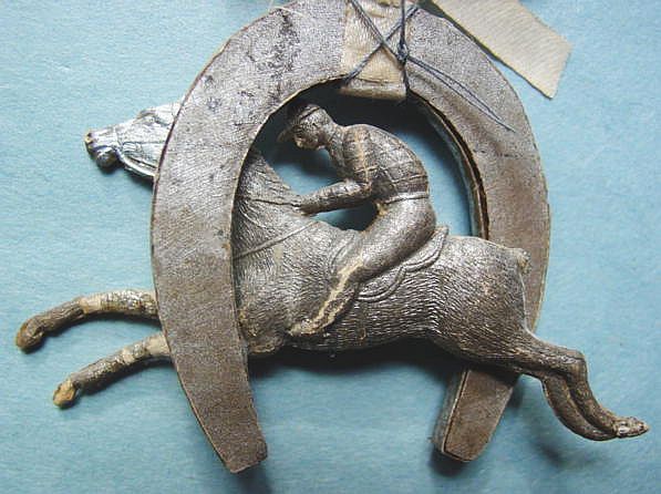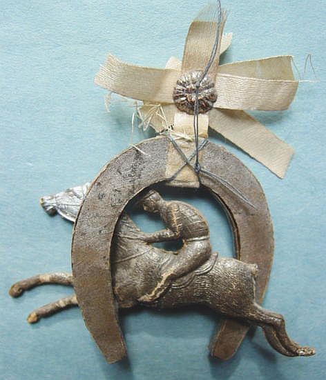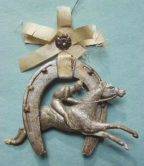 A VERY RARE three dimensional silver dresden jockey on a horse in a horseshoe. Decorated at the top with a pale pink silk ribbon that has a silver dresden rosette on each side. There are some tiny bits of paper loss, but does not detract. The ornament is beautifully embossed and has a wonderful aged patina. The horse's tail is not missing and appears to be cropped in design. Overall, in excellent condition. Additional photos are attached by the magnifying glass icon.