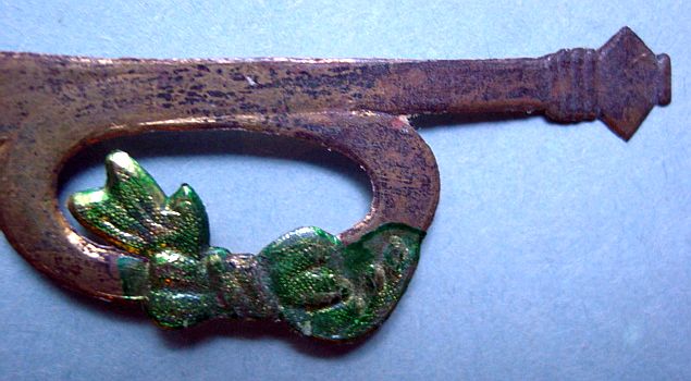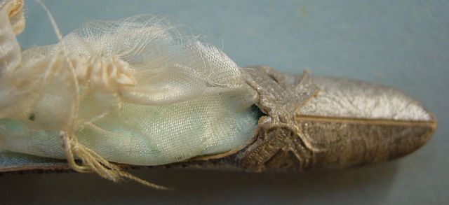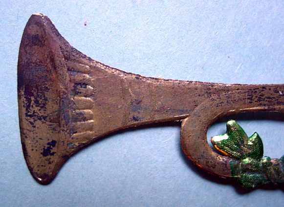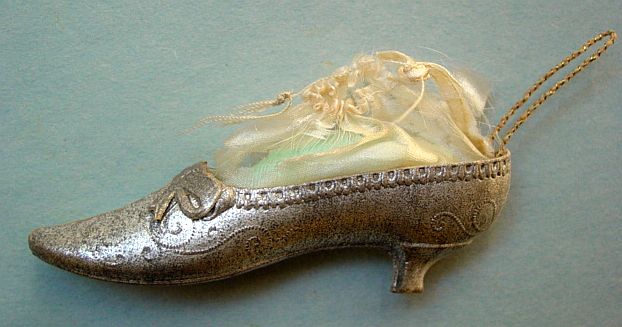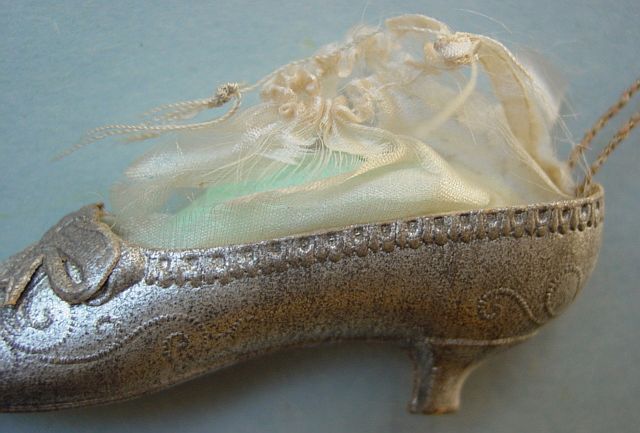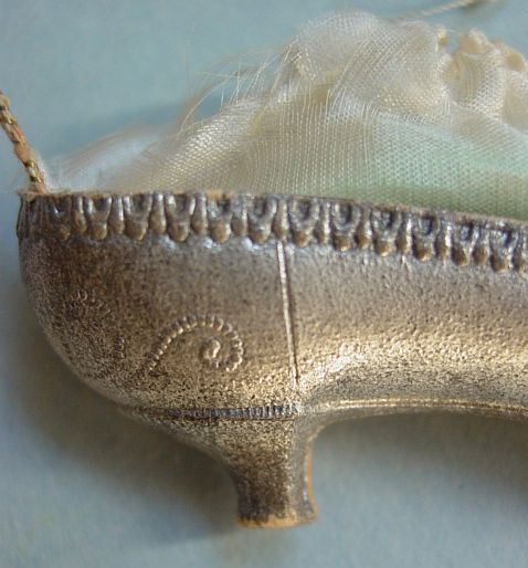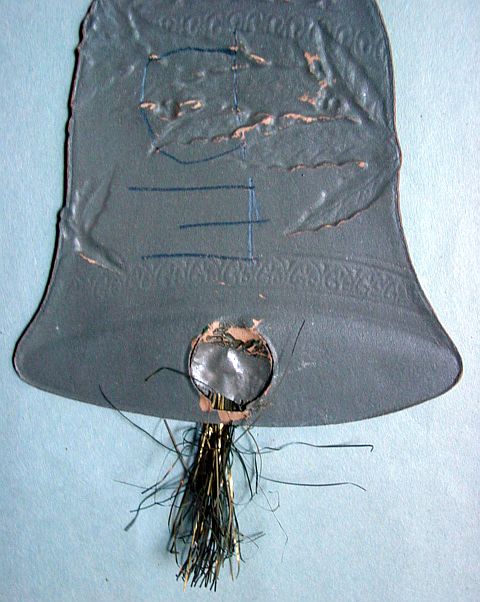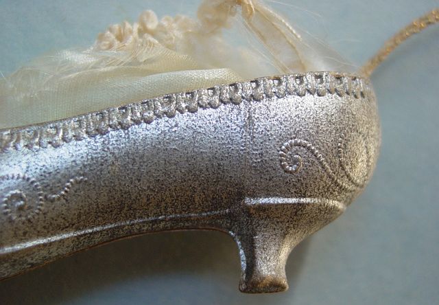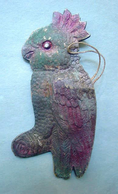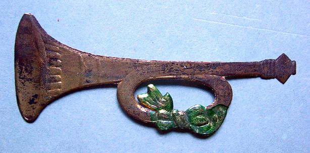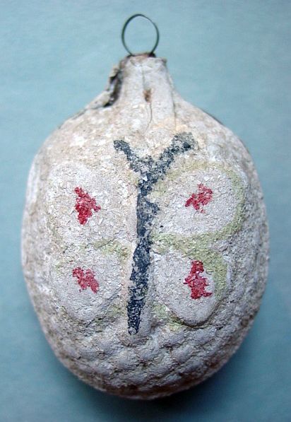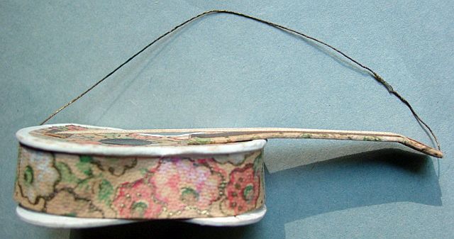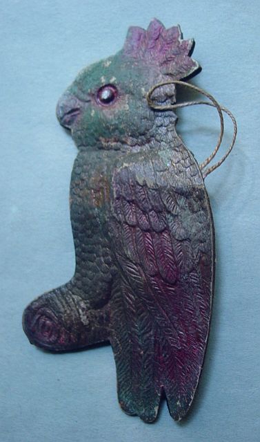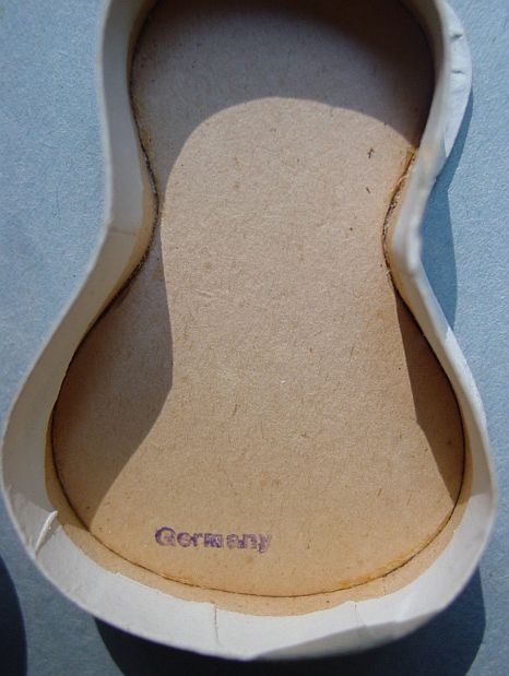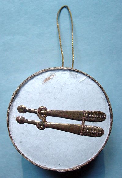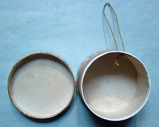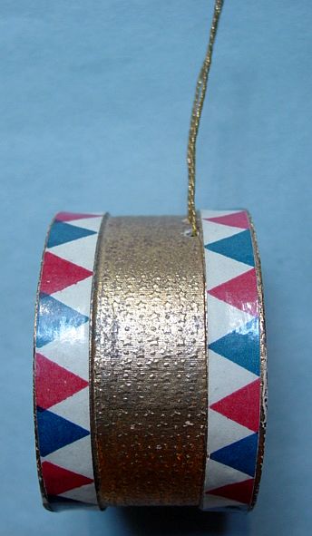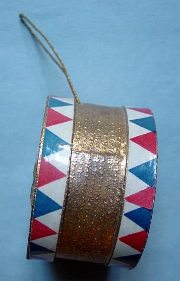A large patriotic dresden drum candy container with embossed gold dresden drumsticks on top. Embossed gold dresden paper in the center and a red, white and blue sawtooth border. It separates for candy retrieval. There is minor wear on the top and a very slight dent. Overall, in excellent condition. Additional photos are attached by the magnifying glass icon.