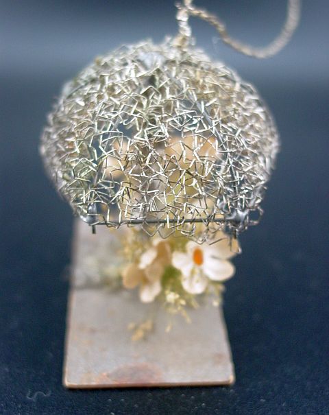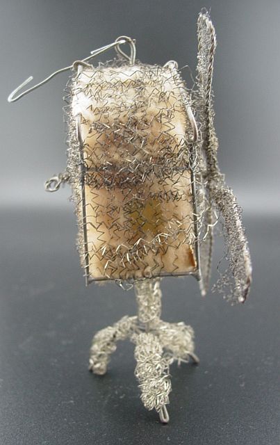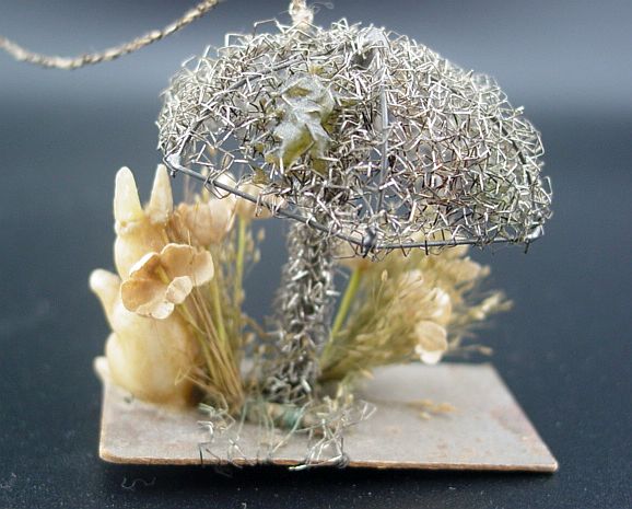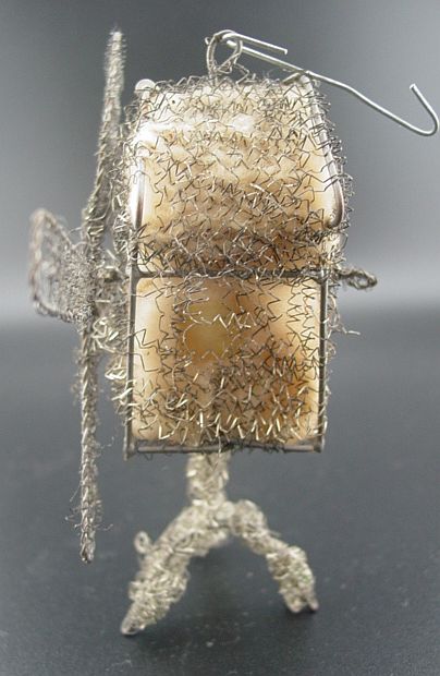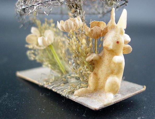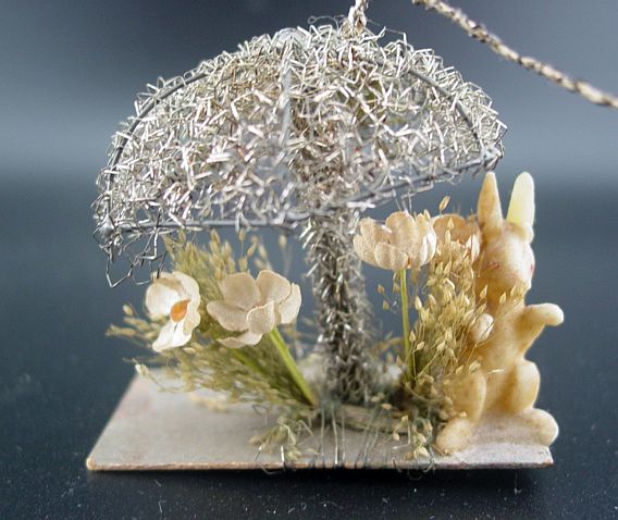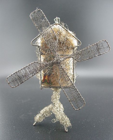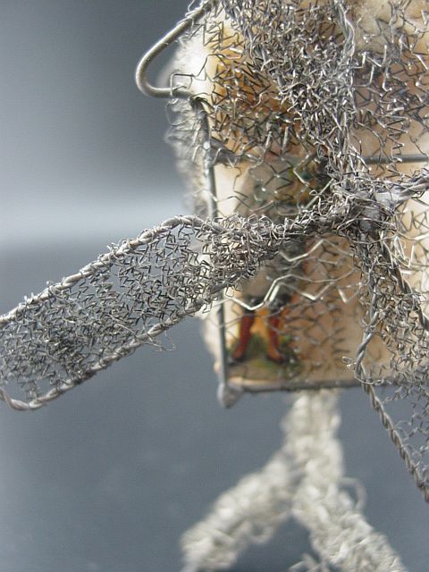 A rare sebnitz windmill ornament. It is on a wire frame filled with cotton batting and elaborately wrapped with curly wire. There is an embossed scrap of a Victorian girl on the front of the windmill under the wire wrapping. There are yellow gel windows on each side. The blades are wire framed and wrapped with crinkle wire. An amazing piece in excellent condition. Additional photos are attached by the magnifying glass icon.