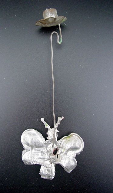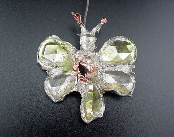 A Victorian soft lead counterweight candle holder with a butterfly. The butterfly is faceted to reflect the light. It has lacquered pale green and red details on the wings and antennae. There are a few dents and dings and a hole in the center. Overall, a great early piece. Additional photos are attached by the magnifying glass icon.