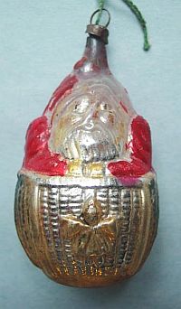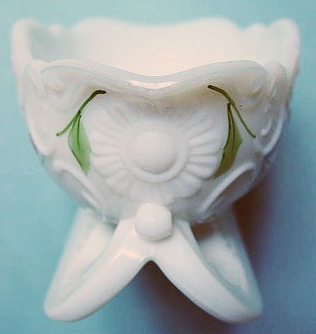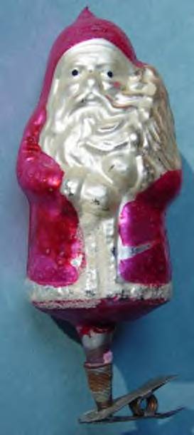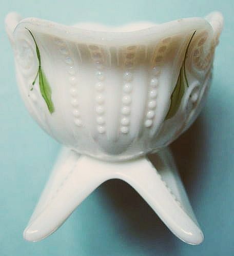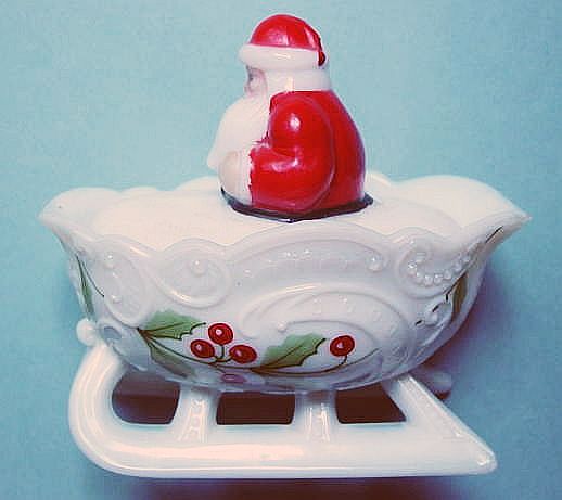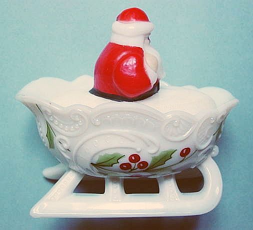 A wonderful and hard to find milk glass candy dish of Santa in a sleigh. It has raised relief decoration on the sleigh and painted holly and berries. Santa is in his red coat, hat and black belt. His face and hands are flesh color. The paint condition is excellent and there are no chips, cracks or damage. On the bottom of the lid and bottom of the sleigh are the stacked WG marks of the Westmoreland Glass Co. A gem! Additional photos are attached by the magnifying glass icon.