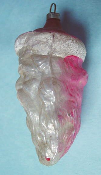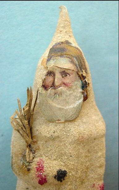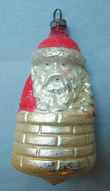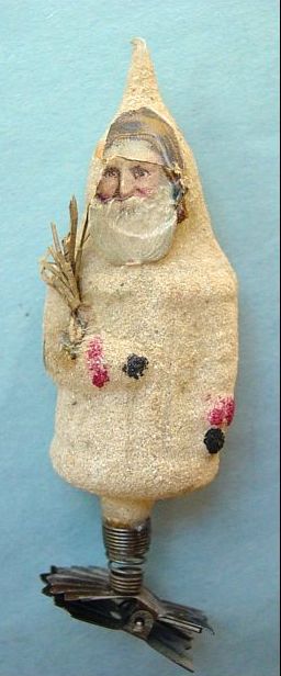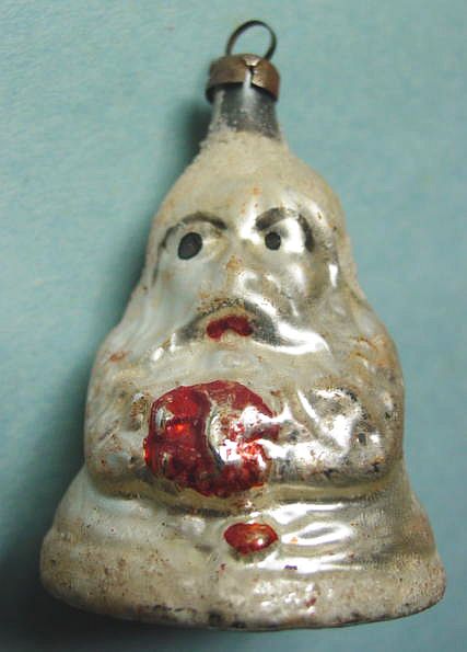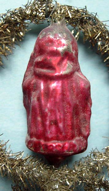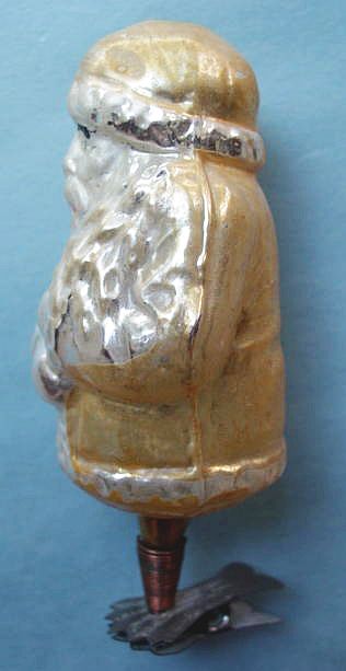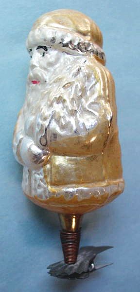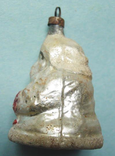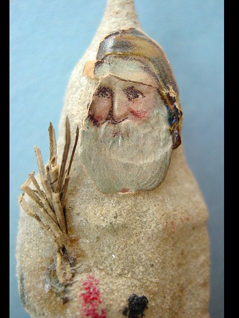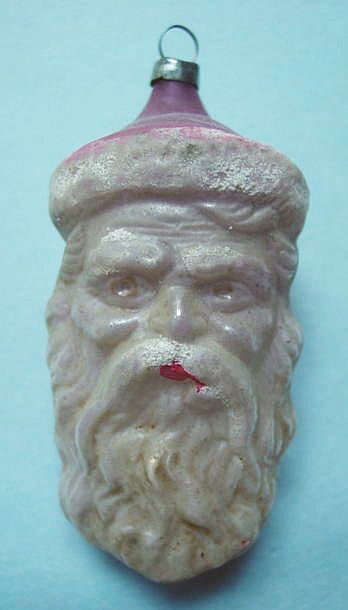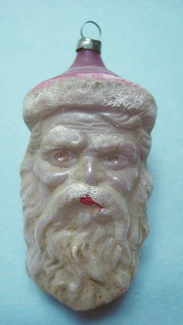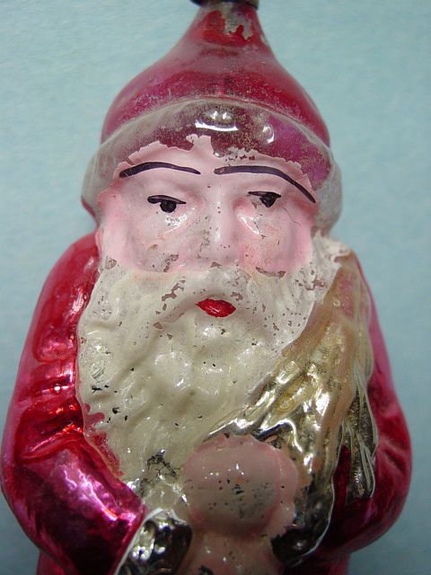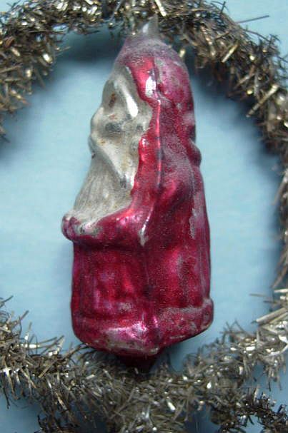 Rare early glass Santa bead ornament with a lametta tinsel comet tail in a tinsel circle. There is some oxidation and a small chip at the top of the pike. Otherwise, the Santa is in a long red coat with minor paint wear. A wonderful piece. Additional photos are attached by the magnifying glass icon.