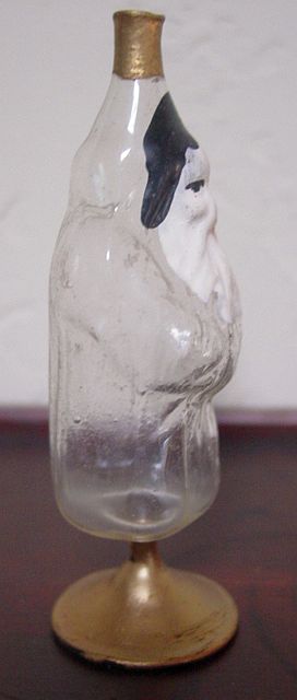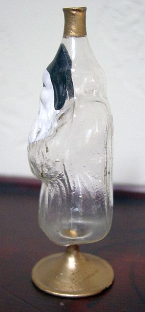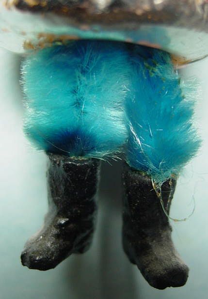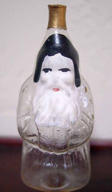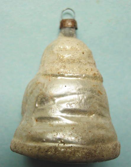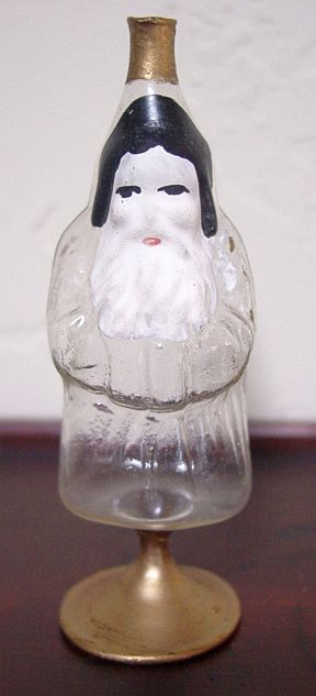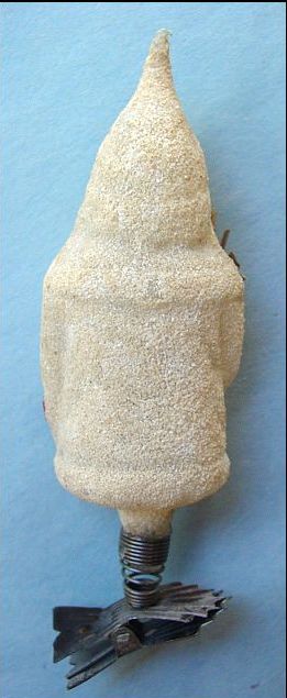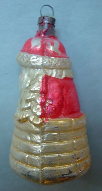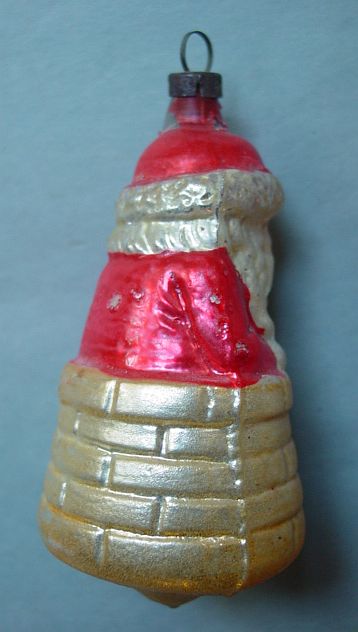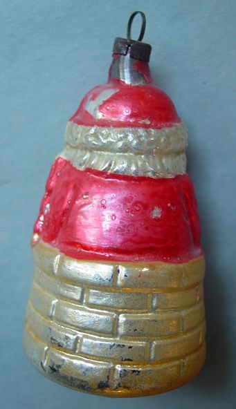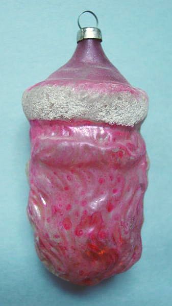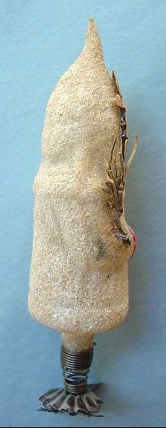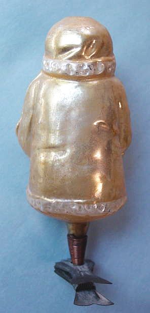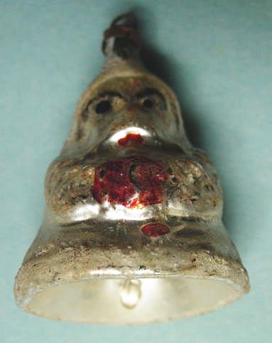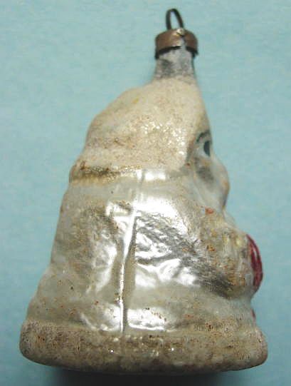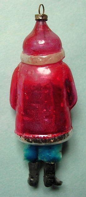 Rare early glass Santa bead ornament with a lametta tinsel comet tail in a tinsel circle. There is some oxidation and a small chip at the top of the pike. Otherwise, the Santa is in a long red coat with minor paint wear. A wonderful piece. Additional photos are attached by the magnifying glass icon.