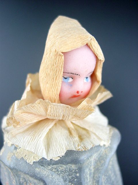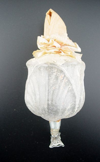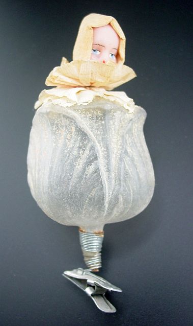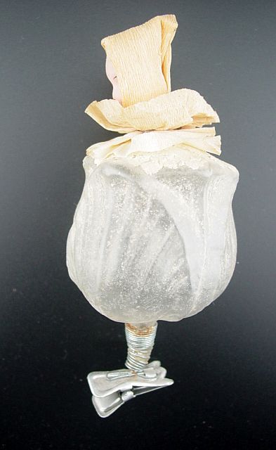 A rare unsilvered glass tulip on a clip with a wax head girl. She is adorned with a crepe paper ruffled collar and hood. Her hand painted face and the wax head are in excellent condition. The tulip has only remnants of what used to be soft pastel white and maybe some yellow details. I do not see any signs of oxidation inside the tulip which would indicate that it might have been silvered. The glass looks almost clear when held up to a light. This definitely is an earlier piece. Additional photos are attached by the magnifying glass icon.