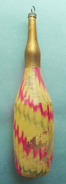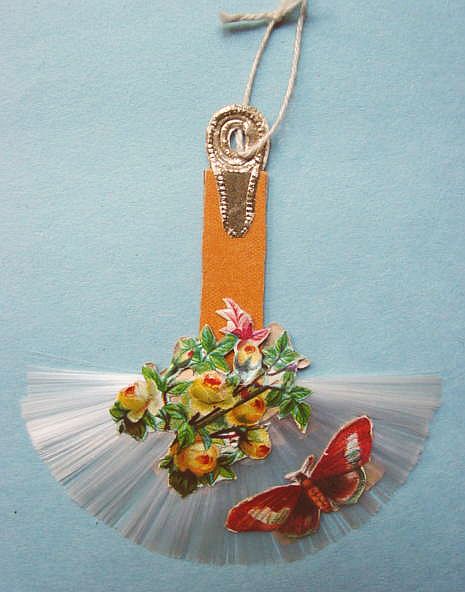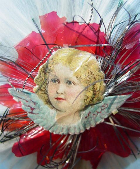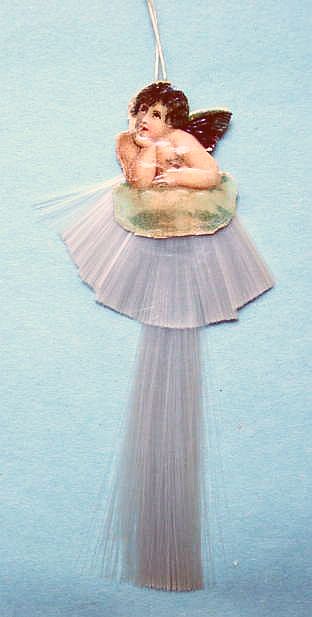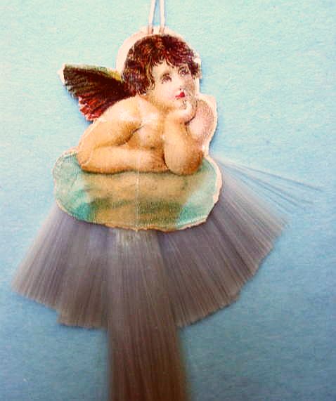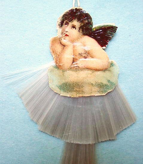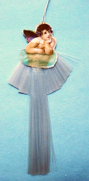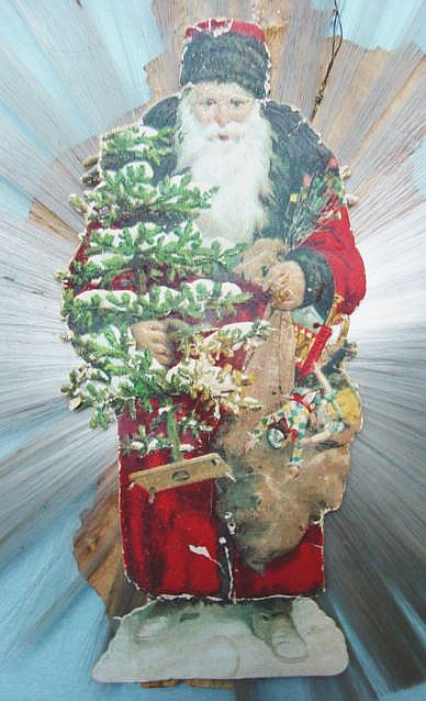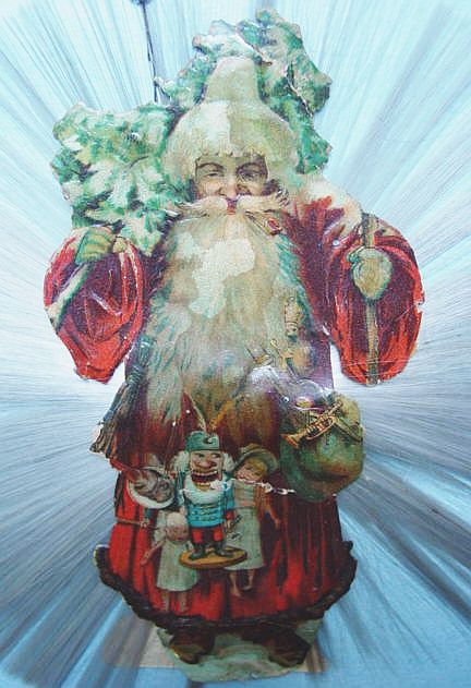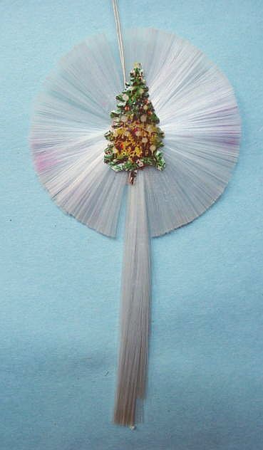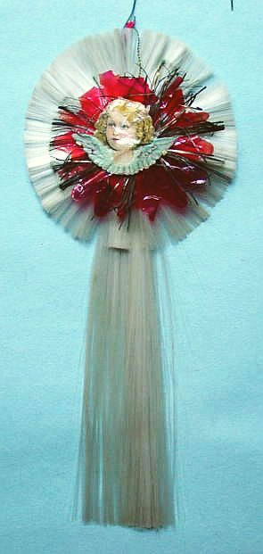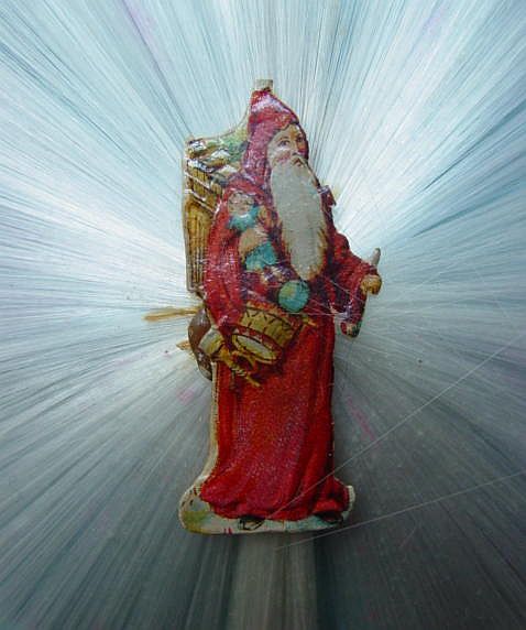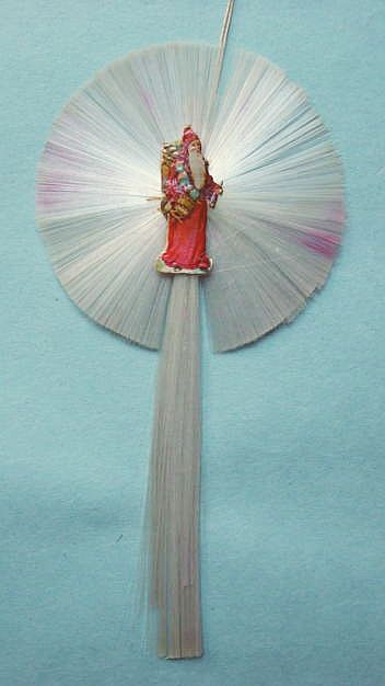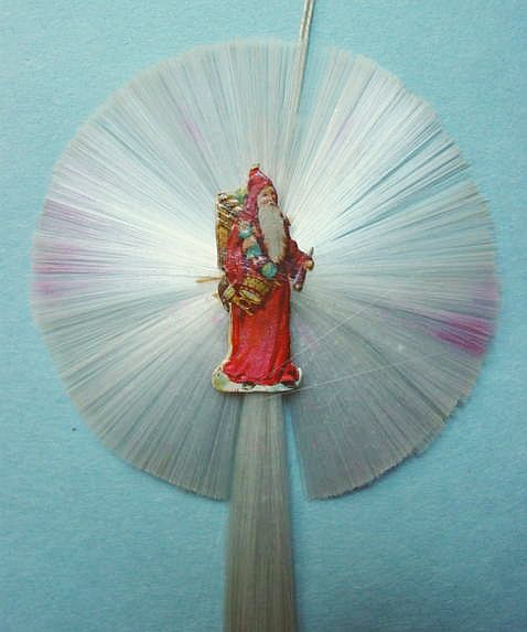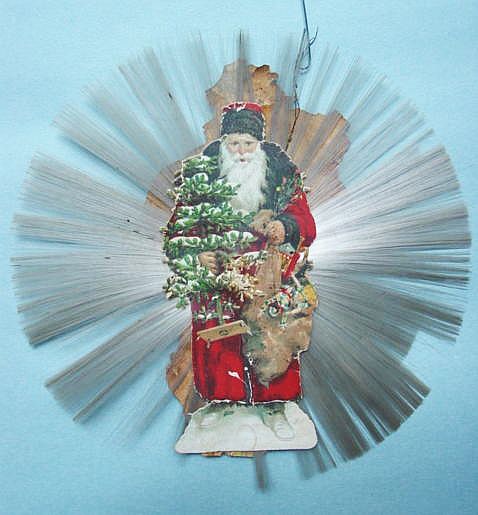 A lovely, early spun glass circle with a comet tail. An embossed scrap of Santa in a long red coat is on one side and a decorated Christmas tree is on the reverse. There are some small areas of shaded pink spun glass on the circle. Overall, in excellent condition. Additional photos are attached by the magnifying glass icon.