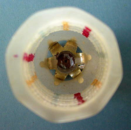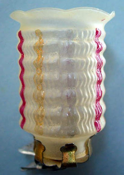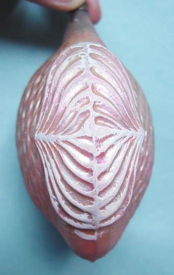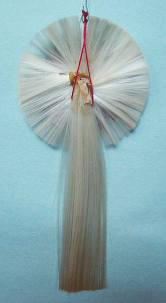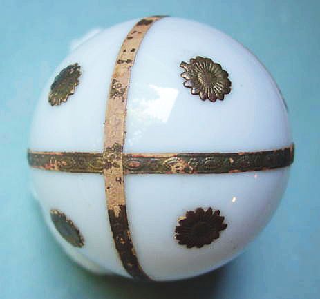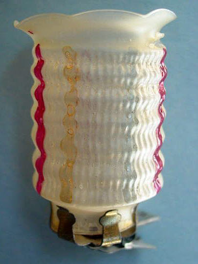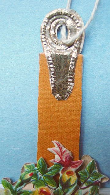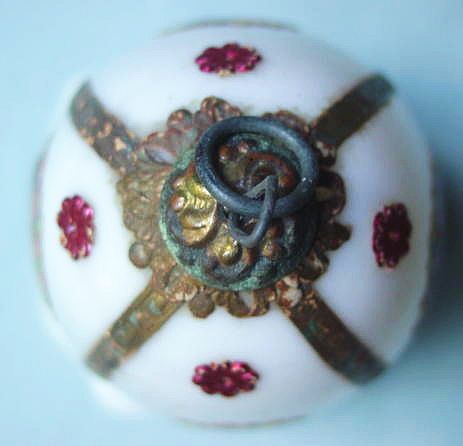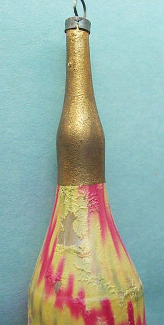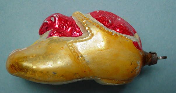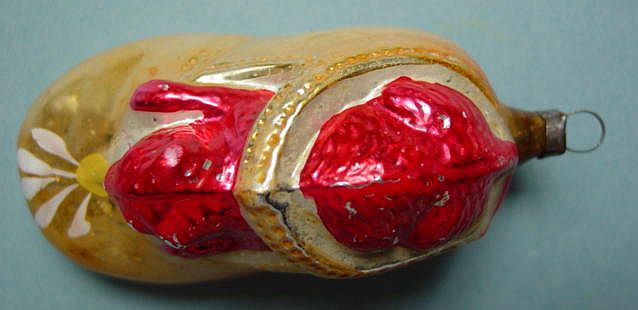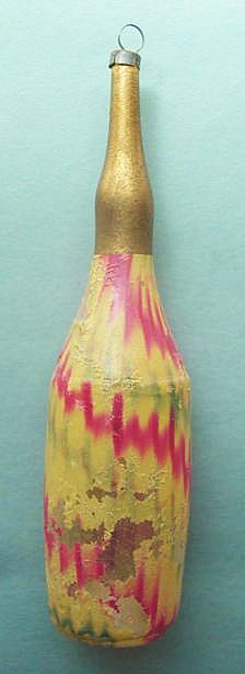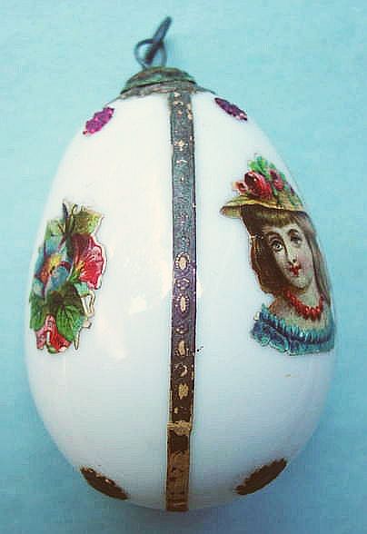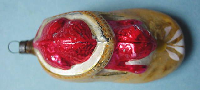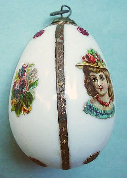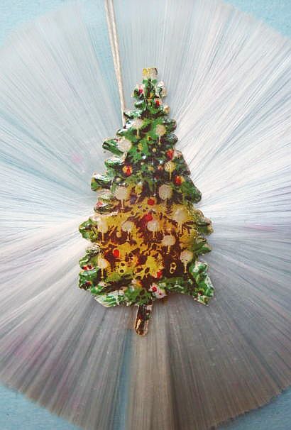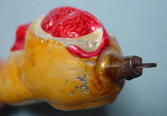 A lovely, early spun glass circle with a comet tail. An embossed scrap of Santa in a long red coat is on one side and a decorated Christmas tree is on the reverse. There are some small areas of shaded pink spun glass on the circle. Overall, in excellent condition. Additional photos are attached by the magnifying glass icon.