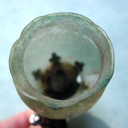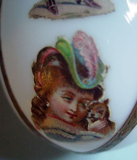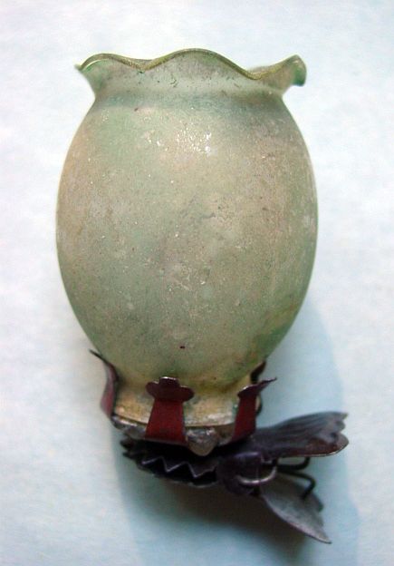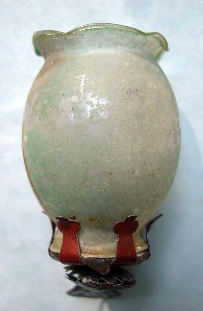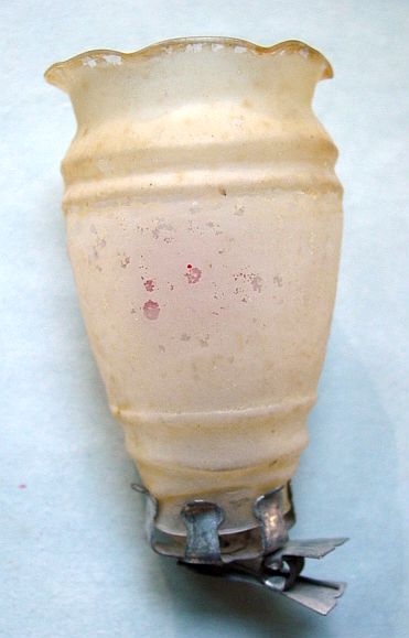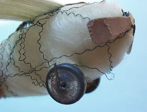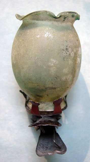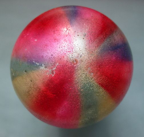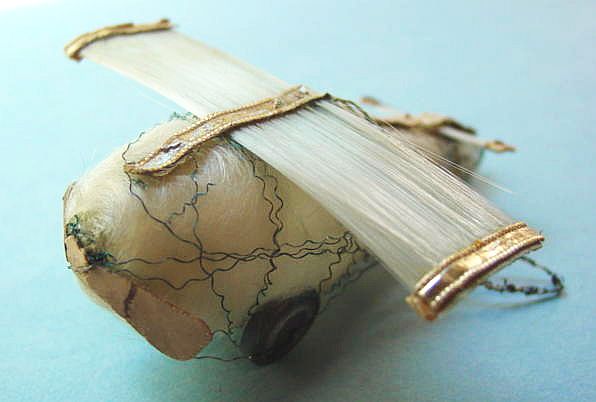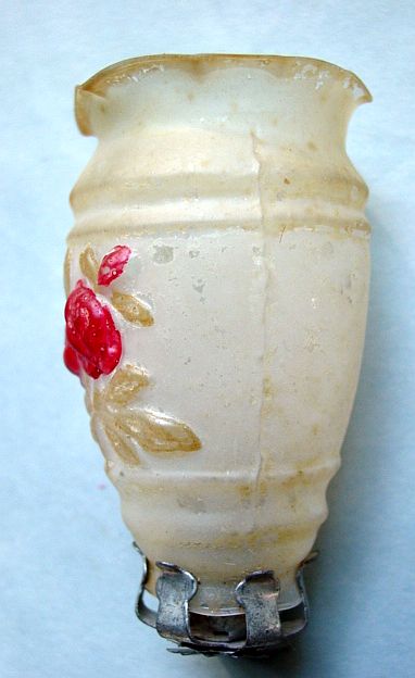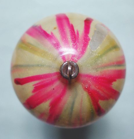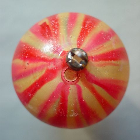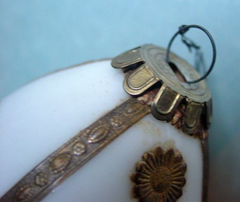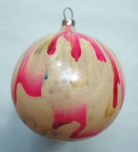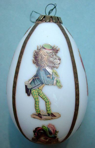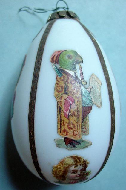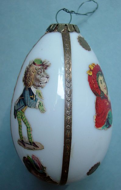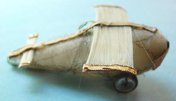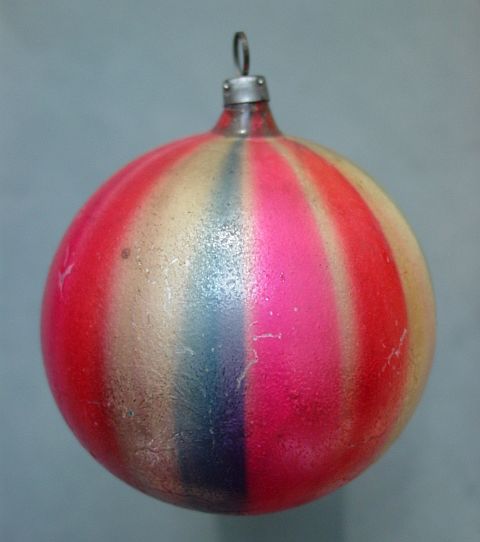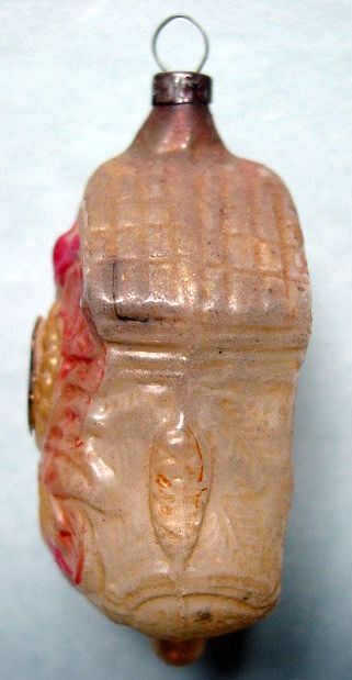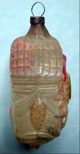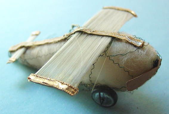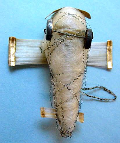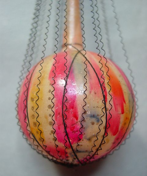 A rare glass airplane that is wire-wrapped and also wrapped in spun glass. It also has spun glass wings attached to the top and rear of the plane. There is dresden trim on the top of the fuselage and on the wings. It has a paper propeller and small metal wheels. It also retains its original tinsel cord hanger. Overall, in excellent condition. Additional photos are attached by the magnifying glass icon.