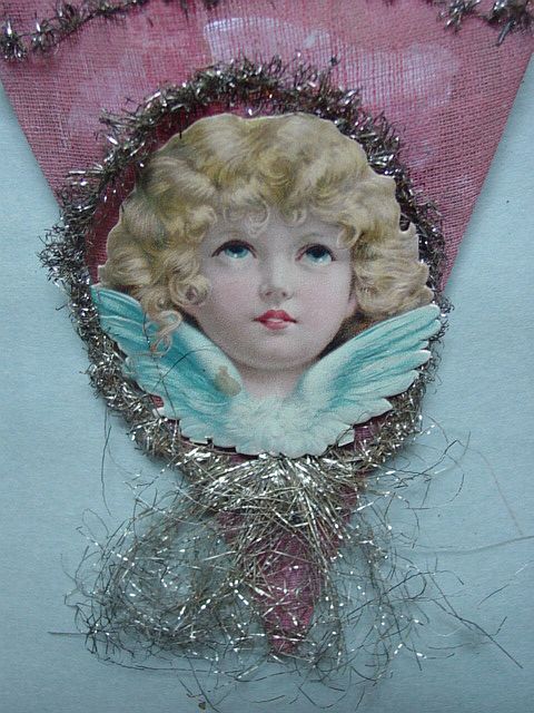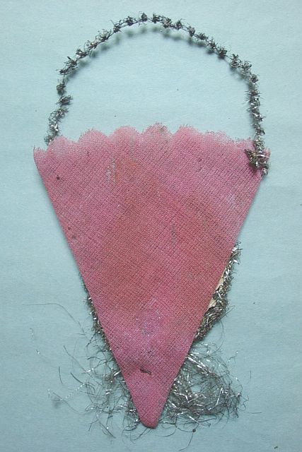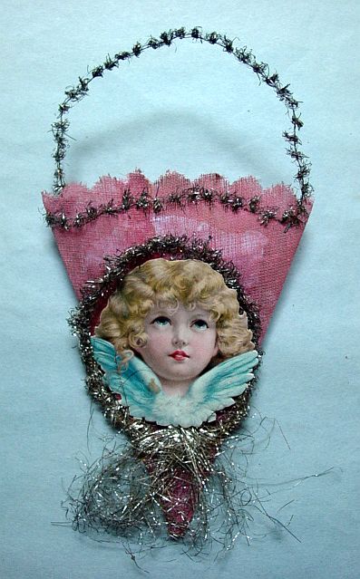 A beautiful Victorian pink stiff net cornucopia candy container. It is decorated with a sweet embossed angel with wings scrap. It has a tinsel handle. The net opens up to hold the candy. The angel is surrounded by tinsel with a great tinsel spray. In excellent condition. Additional photos are attached by the magnifying glass icon.