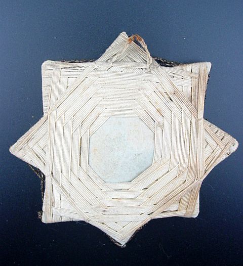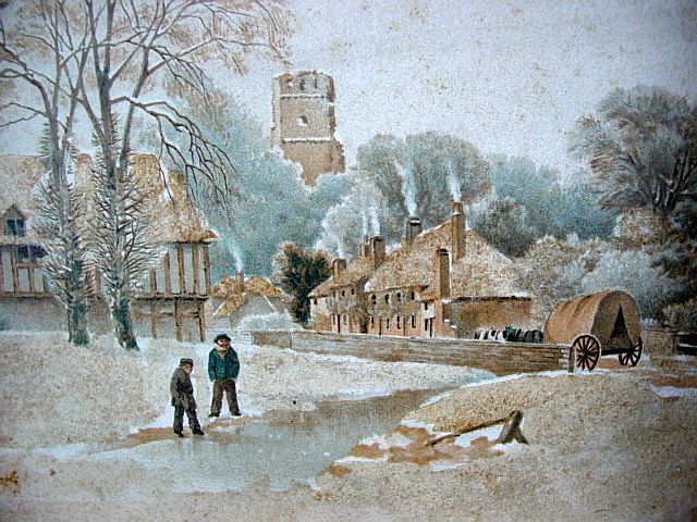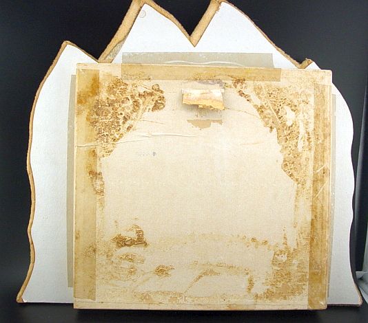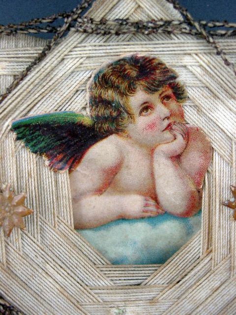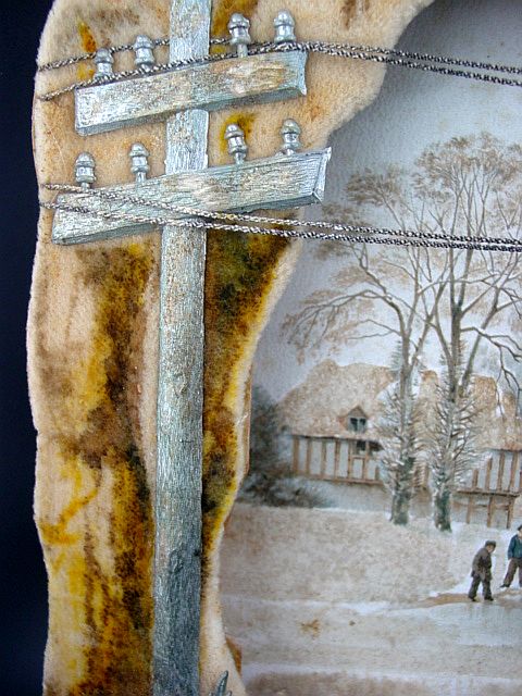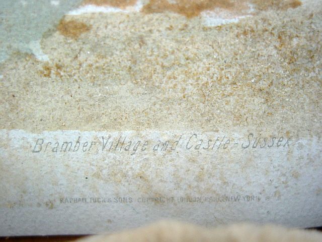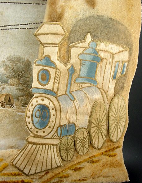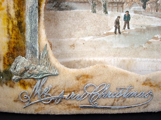 An unusual Christmas shadow box titled, Bramber Village and Castle Sussex. It is marked Raphael Tuck and Sons, Copyright London, Paris, New York. The box is made of cardboard and it used to be an easel back which is missing. The mountain design is covered with velvet mounted on cardboard. There is a newer backing to the velvet. The velvet has brown and yellow painted details. The beautiful center watercolor winter scene is covered with glitter. The locomotive is applied silk on cardboard and is painted in watercolor shades of blue and gold details. The embossed silver telegraph pole has tinsel cords attached to it. There is a small piece missing on the Merry Christmas greeting on the bottom. A super piece! Additional photos are attached by the magnifying glass icon.