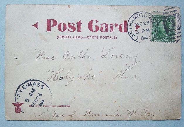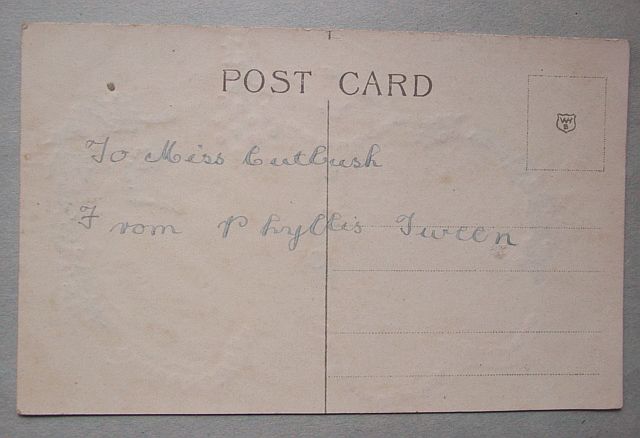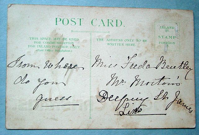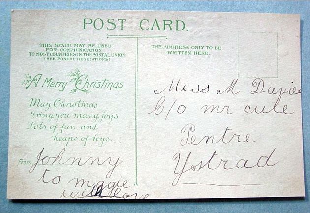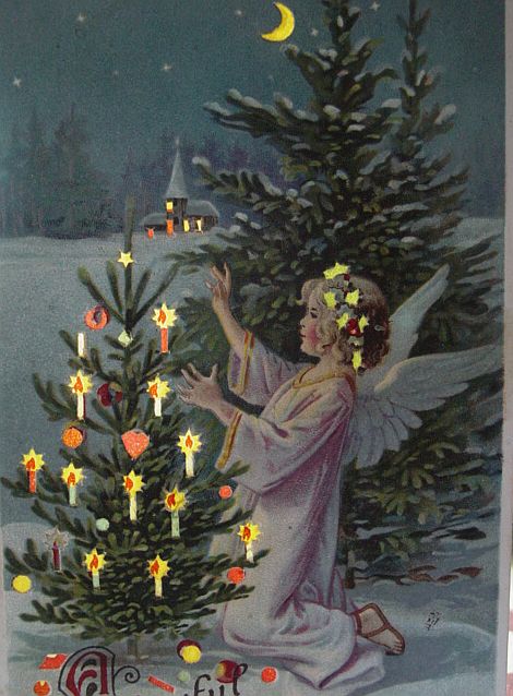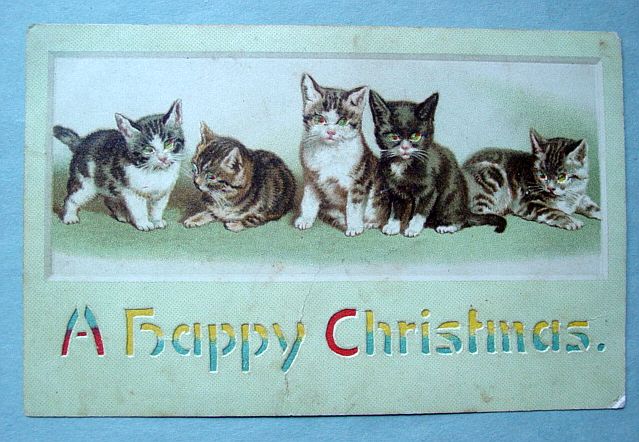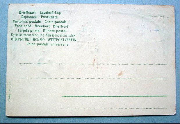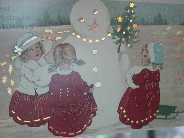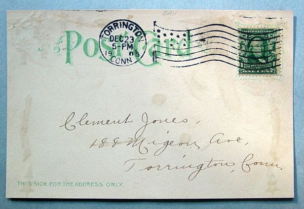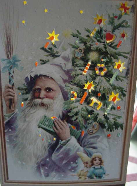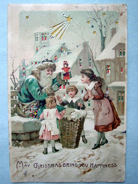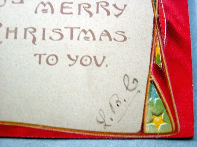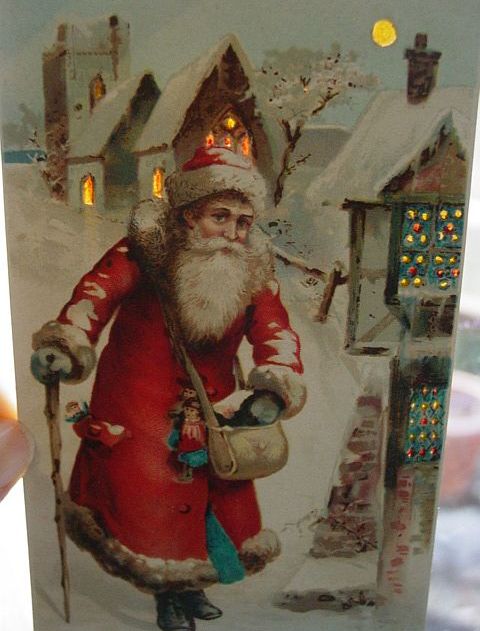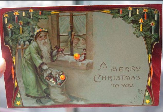 A rare hold-to-light Christmas postcard with Santa in a long green coat setting toys on a window sill while two children sleep inside. There are initials lightly written on the lower right hand corner. Postally used and dated either 1903 or 1905. There is a very minor bend, hardly noticeable, on the top left hand corner. Otherwise, the condition is excellent. Additional photos are attached by the magnifying glass icon.