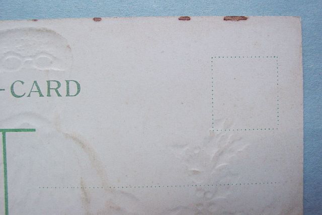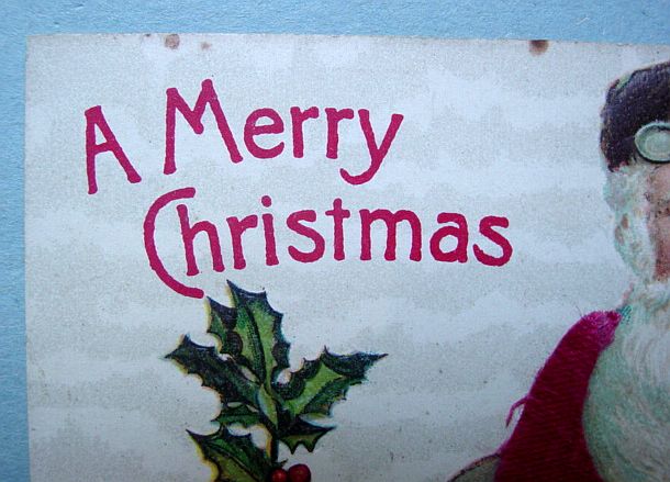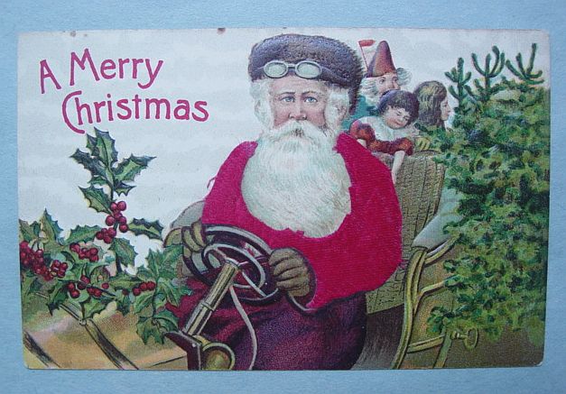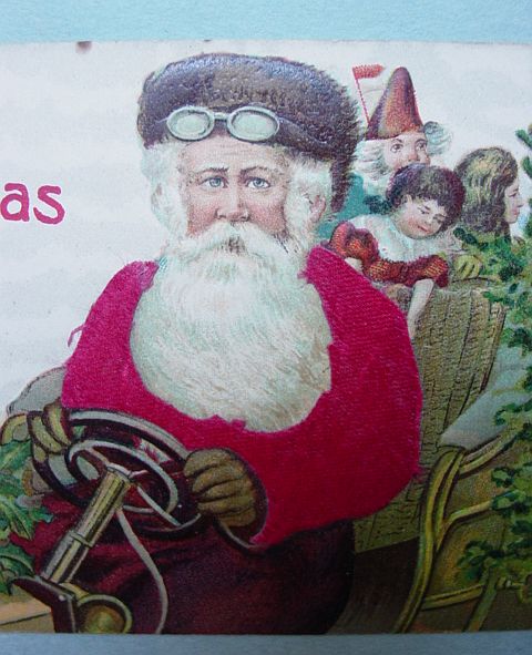 A Christmas postcard with an applied silk coated Santa with a roadster car that is loaded with toys. It is postally used and dated 1908. There is some discoloration on the center top edge. It has rounded corners. It is beautifully embossed and the colors are great. There is an inscription, "Cousin Bill" in the lower right corner. Additional photos are attached by the magnifying glass icon.