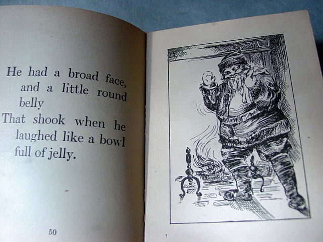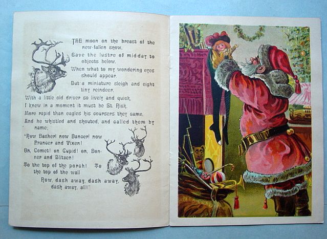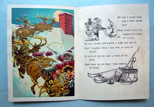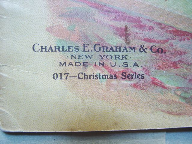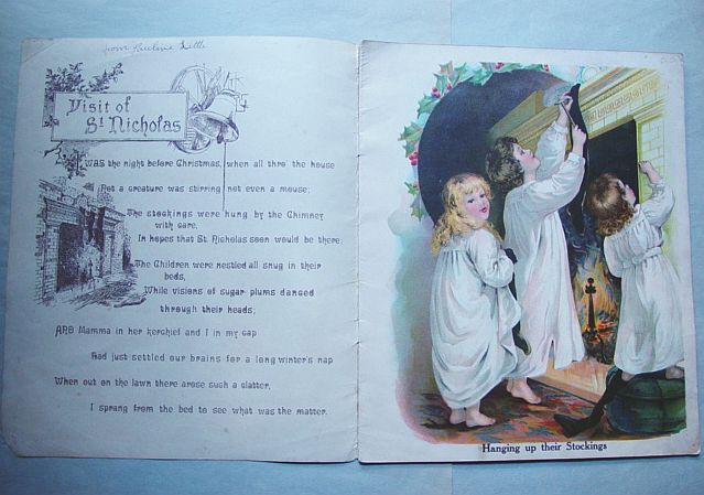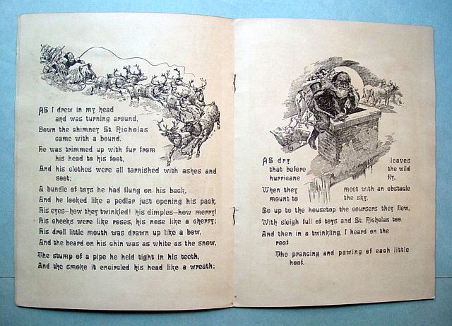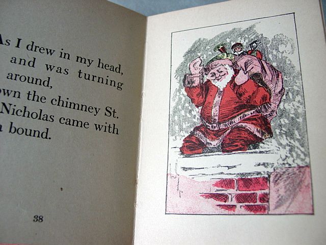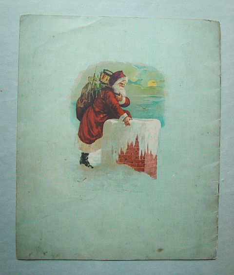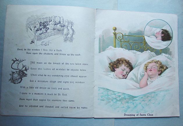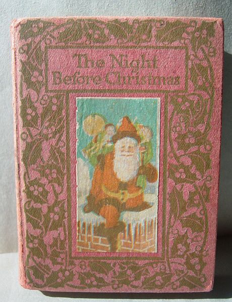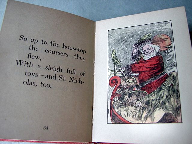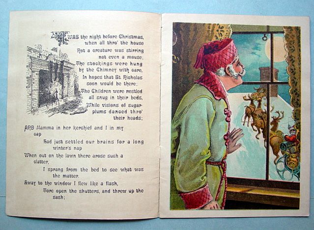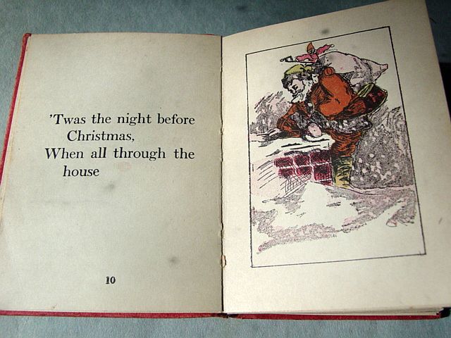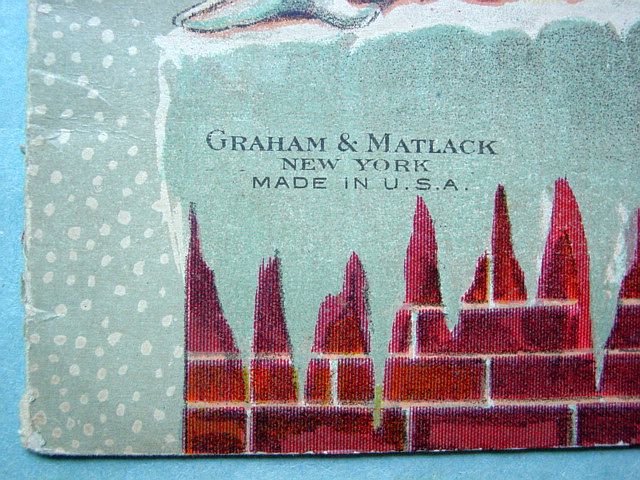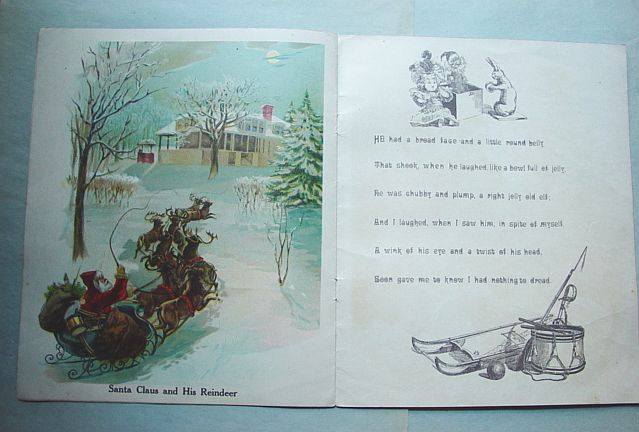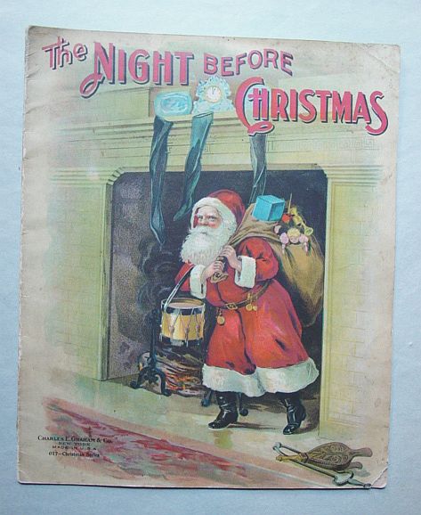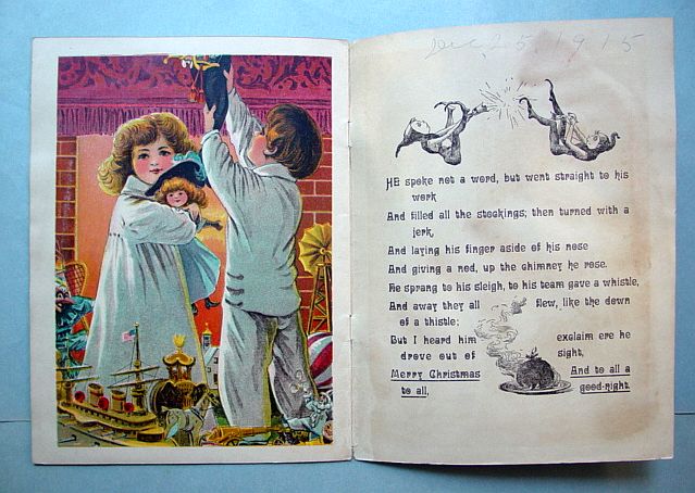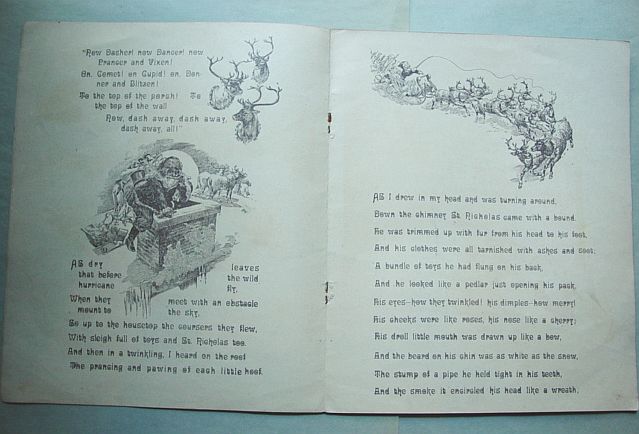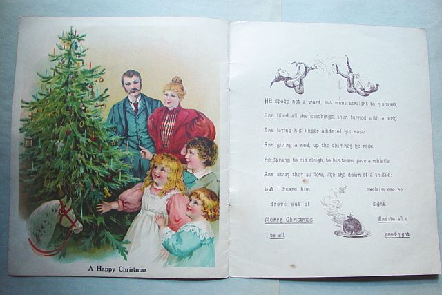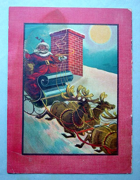 This is a softcover book titled, "Night Before Christmas" published by Graham & Matlack, New York, USA. From the Jolly Santa Claus Series. There is no copyright date, but dates early 1900's and on the last page there is a pencil inscription Dec. 25, 1915. There are six full page color prints including the front and back covers. There are also black and white illustrations. The front cover is fantastic. It almost appears three dimensional. It has a stapled spine and there is some minor paper wear on the outside of the spine and corners. On the bottom right corner, there are a couple of interior pages that have a 1" crease, but mostly noticeable on the back cover. Also, on the last page there is an area with some discoloration. Except for darkening to the pages from age and handling, this wonderful book is in very good condition. Additional photos are attached by the magnifying glass icon.