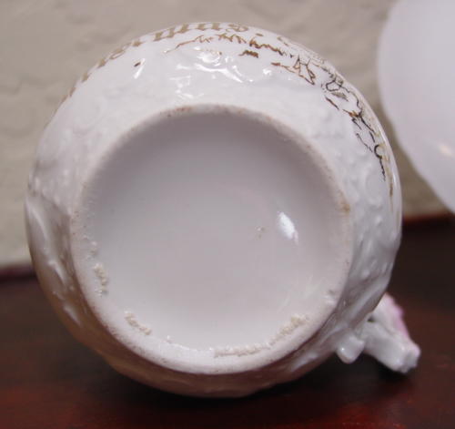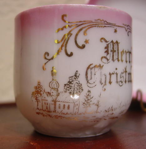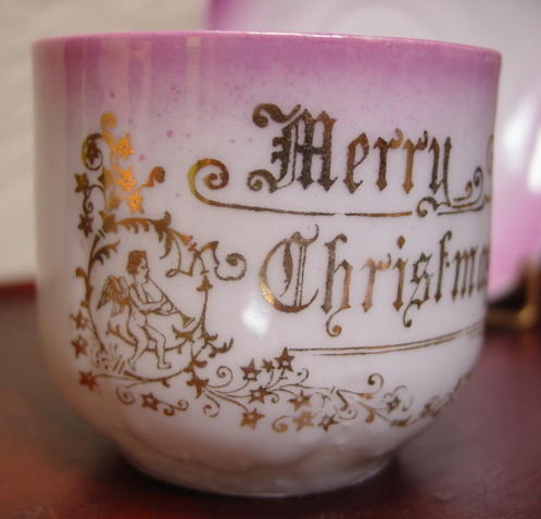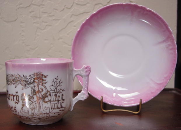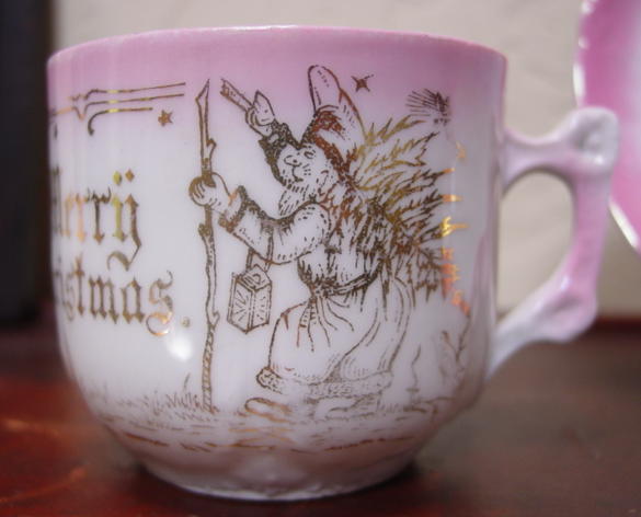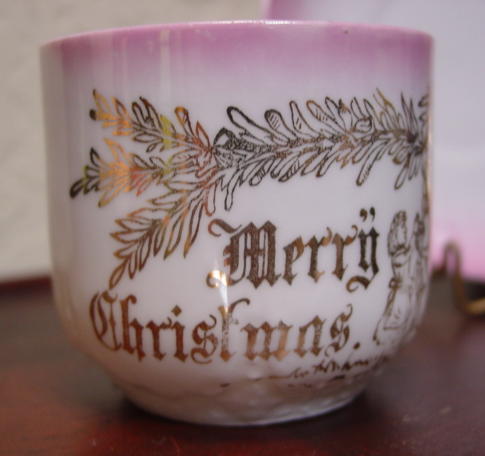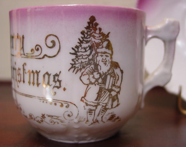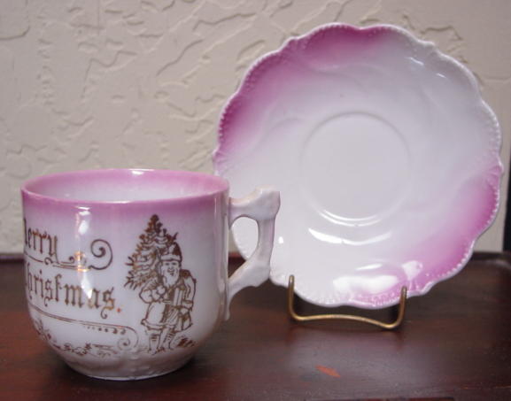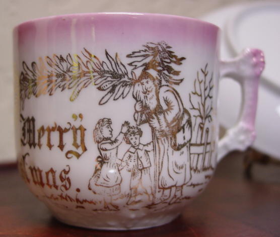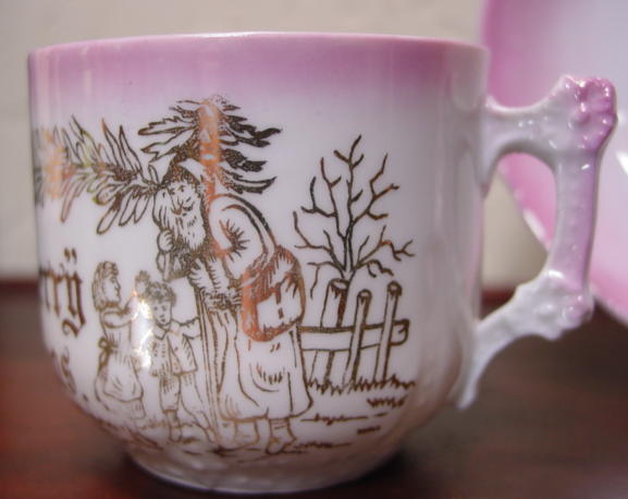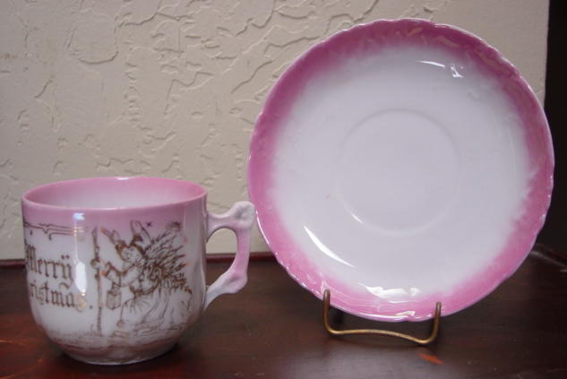 A great, early pink lusterware china child's Christmas cup and saucer. It is decorated with, "Merry Christmas" and Santa in a long robe greeting two children with a pine bough above them. Relief molded designs are on the lower portion of the cup, handle and saucer edge. Overall in excellent condition and charming!! Additional photos are attached by the magnifying glass icon.